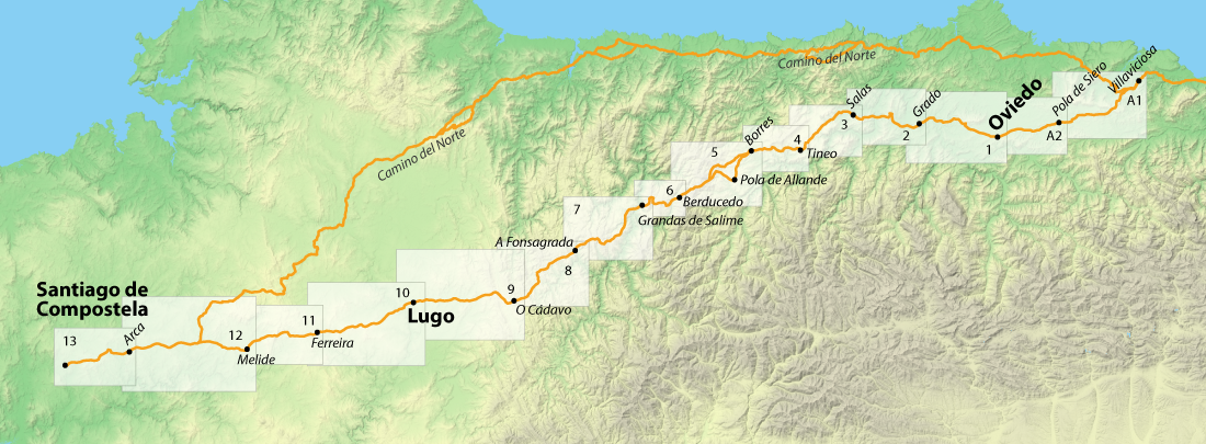 El recorrido más habitual es de unos 320 km, desde Oviedo hasta Santiago de Compostela, pasando por Lugo. Una división típica de etapas sería: